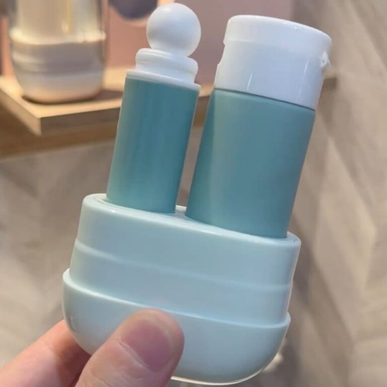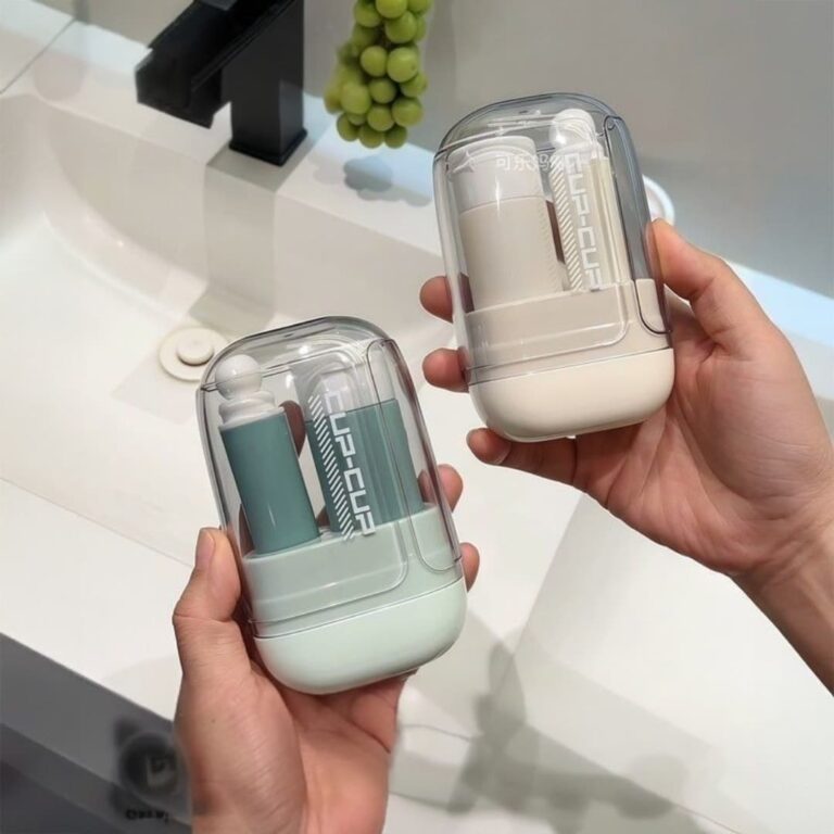 The ultimate travel accessory for business trips and vacations. This compact 3-in-1 organizer features a "German Quality" inspired design for premium durability. Key features include a magnetic-style dust-proof cover that doubles as a rinsing cup, a refillable dispenser bottle for toiletries, and a specialized slot for your toothbrush—all in one sleek, portable capsule.
