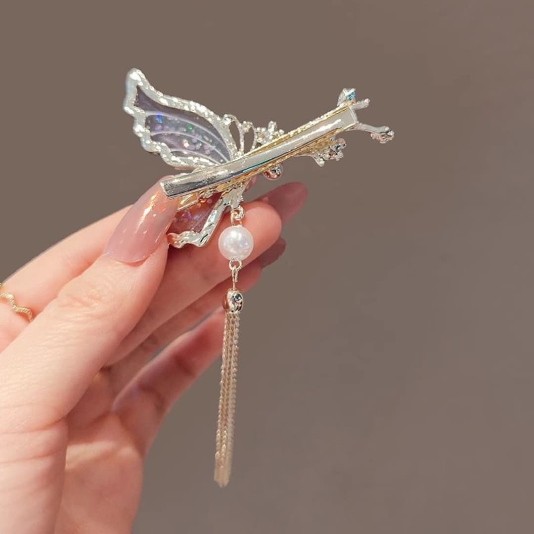 Essential Features The ultimate fairy-tale accessory. This exquisite hair clip features Moving Wings that flutter gently with your movement, mimicking a real butterfly. Key features include a shimmering translucent design, elegant Faux Pearl accents, and a flowing Silver Chain Tassel. The sturdy duckbill clip ensures a secure hold, making it perfect for adding a touch of magic to any hairstyle.
